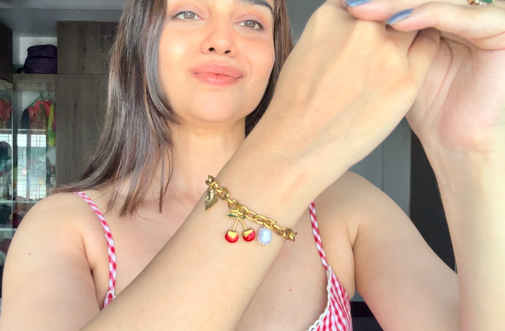 Crafted in 18k gold plating this charms bracelet with cherrys,pearl and gold leaf is the seasons hot pick.Begin the hot chocolate season with this charms bracelet that goes with everything and adds the perfect cuteness and colour to any outfit.