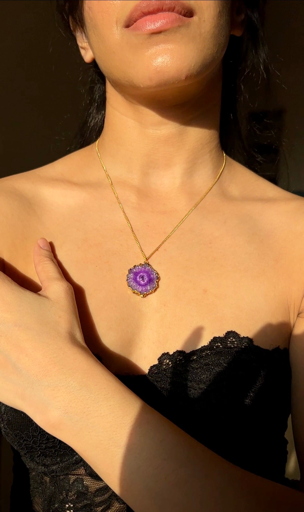Eye catchin and beaming ultra violet this Cosmos necklace is handcrafted in intricately cut natural stone with its natural colour layering.A conversation starter please.