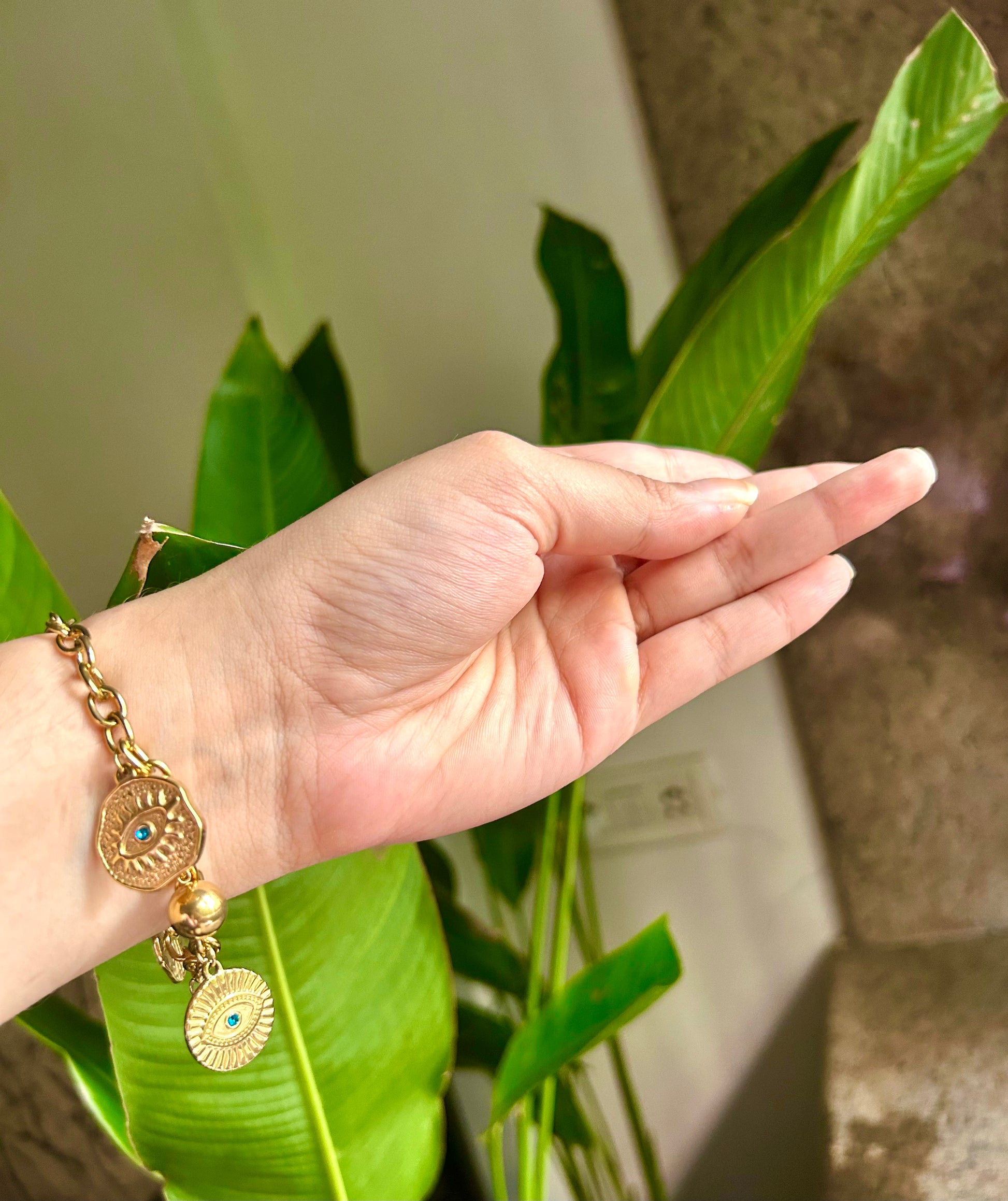 Dipped in 18k gold plating with intricate international design this handcrafted Evil eye and Faith Coin charms bracelet Elevates your aura and everydaywear.Anti tarnish,water resistant,Hypoallergenic and skin safe with long lasting shine and premium plating.