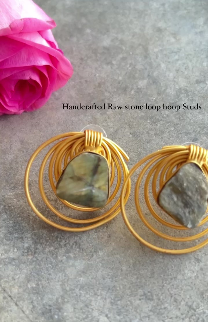 Handcrafted from premium uncut natural stones paired with a pure brass loop, these Loop Whoop Statement earrings bring a refined blend of raw elegance and artisanal craftsmanship. Their distinctive design enhances any ensemble with a subtle yet striking aura, making them a sophisticated choice for those seeking timeless style with a natural edge.Its crafted in pure brass and is extremely light weight.