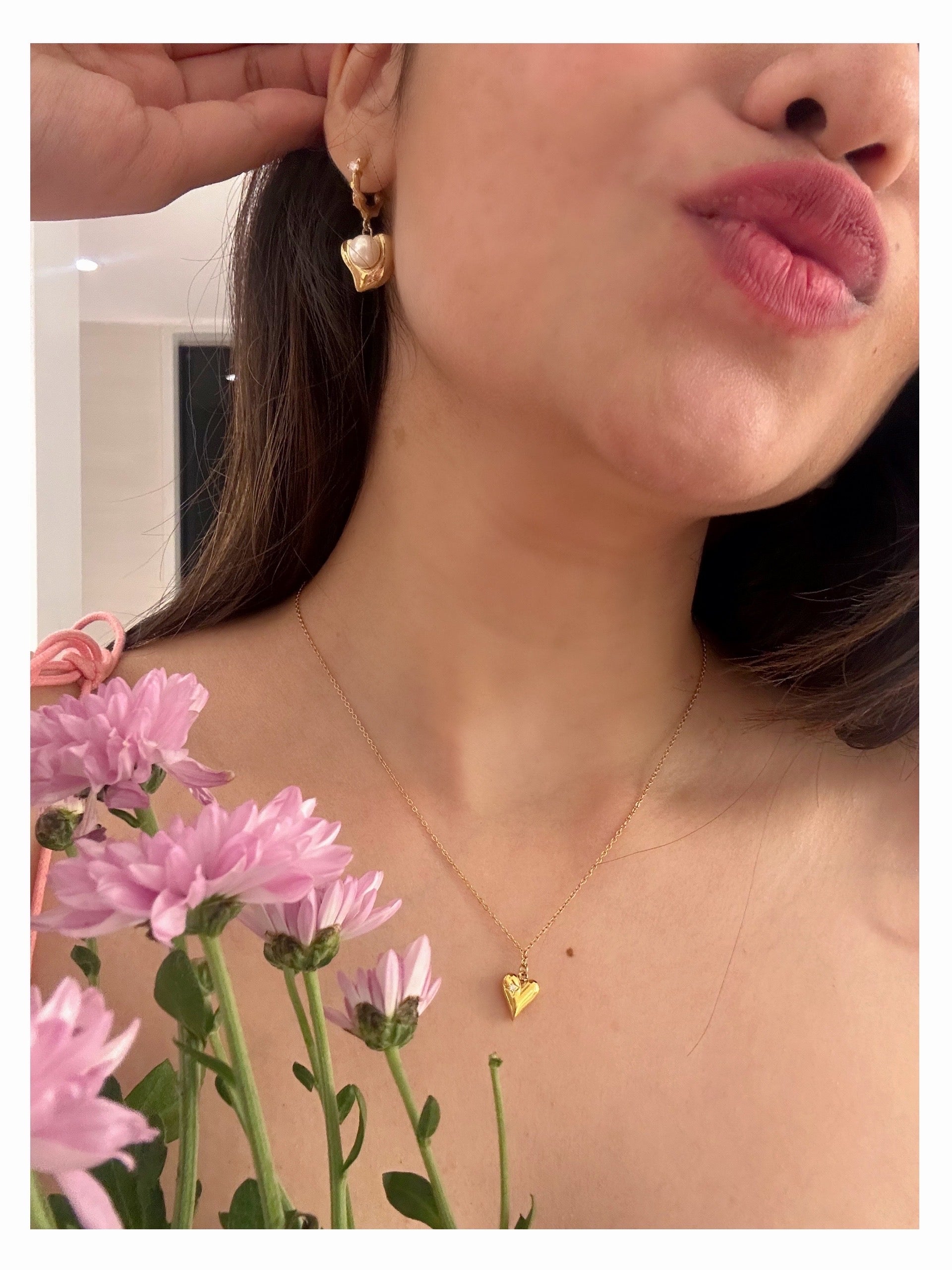 Dipped in 18k Gold plating,anti tarnish finish,316 L steel and water resistant this Love potion Necklace and earrings set is a perfect pair to own or Gift.The earrings have stone and pearl work and intricate designing and the necklace is so dainty that you will not want to take it off.